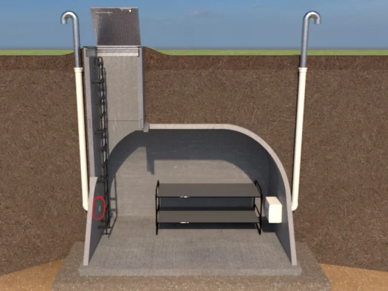 A highly fortified micro-installation featuring an impenetrable hatch, conceived to safeguard priceless assets.